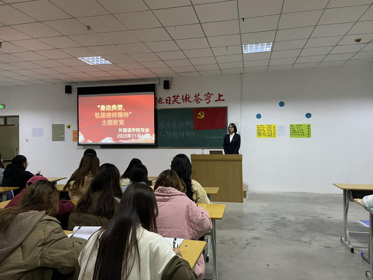 为加强我院党员同志的学习热情和思想觉悟,外国语学院党委于11月14日下午14:30在教学楼9001教室组织全体学生党员通过集体学习的方式开展“学习身边典型,弘扬榜样精神”的活动交流会。