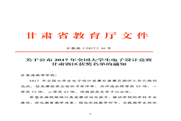 “2017全国大学生电子设计竞赛”我院代表队荣获甘肃赛区二等奖。在竞赛中,我系三名学生的专业知识能力得到了专家组充分的肯定,同时也为他们在今后的学习中起到了指导作用。通过此次大赛,充分体现了我院学生具有良好的创新意识和创新精神,夯实了他们的实践动手能力,为创新型人才的培养起到了引领作用。祝愿我院学生紧跟时代步伐,将理论知识转化为实践应用,准确把握新一轮实践创新的趋势和机遇!