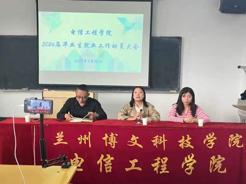 2023年9月20日下午16:50,电信工程学院在教学楼9018教室召开了2024届毕业生就业推进动员大会,此次就业动员大会在线上同步进行。电信工程学院院长郭丽君,副院长马白、颜侠,以及分管就业辅导员和毕业班班主任、全体毕业班学生参加了本次会议。