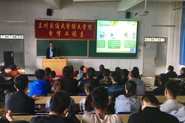 为积极响应“网络安全周”宣传活动,加强网络安全教育宣传,营造安全、健康、文明、和谐的网络校园,兰州交通大学博文学院电信工程系于2018年9月20日中午在南校区教学楼西T4教室举行网络安全宣传讲座。出席本次活动的嘉宾有电信工程系主任郭斌、电信工程系学生管理副主任柴明喜、电信工程系马君、陶佳老师,以及电信工程系各班学生代表。