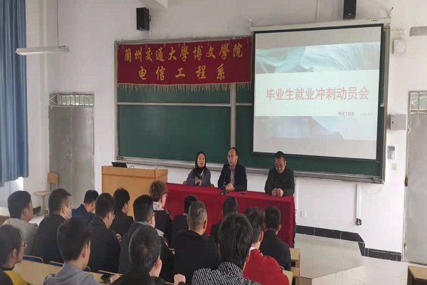 为了积极促进2021届毕业生就业工作,提高职业规划意识,兰州交通大学博文学院电信工程系于2021年4月15日在南校区教学楼西T4教室召开了2021届毕业生就业冲刺动员会。莅临此次大会的领导有兰州交通大学博文学院学生管理副院长刘德光,电信工程系主任郭丽君,学生管理副主任柴明喜,电信工程系2021届毕业生辅导员刘继伟老师及2021届所有未就业学生。