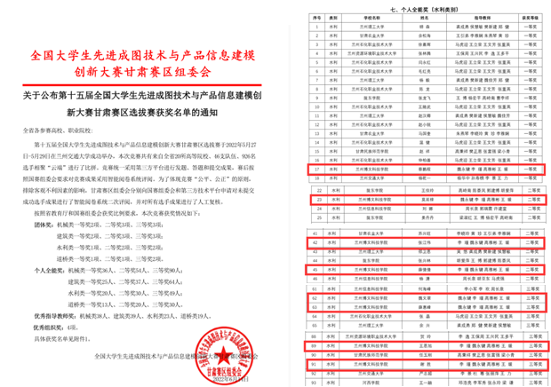第十五届全国大学生先进成图技术与产品信息建模创新大赛甘肃赛区选拔赛于2022年5月27日-5月29日在兰州交通大学成功举办,我校工程管理学院积极组织学生参赛,学生代表队在李瑾、高雅彬、魏永键、王媛老师的指导下,充分发扬“勤学习、善思考、强素质、瞻高远”的院训,参加了建筑类、水利类竞赛,与来自全省20所高等院校、46支队伍、926名选手相聚“云端”比拼。经过指导老师和参赛学生的共同努力,最终获得建筑类:学生个人全能三等奖3个;水利类:学生个人全能一等奖1个,二等奖3个,三等奖4个的优异成绩。