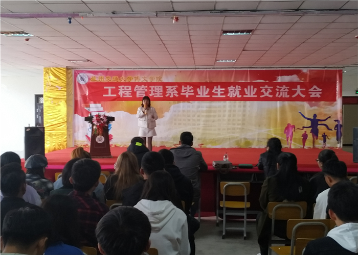为了进一步做好2020届毕业生就业工作,让同学们了解当前就业形势,进一步帮助同学们树立正确的就业观,提高就业质量,工程管理系于2019年10月23日下午在北校区体育馆301教室举行“2020届毕业生就业交流大会”。我系特邀请招生就业处王少丽副处长为我系毕业生作就业动员交流,工程管理系主任李瑾,学生管理副主任肖东,辅导员曹泷以及2020届毕业班学生参加了本次大会。