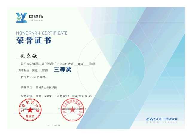 由工业软件创新合作中心、广东省工业软件创新中心指导,广州中望龙腾软件股份有限公司主办,华南理工大学承办,以关键核心技术“更稳定、更强大、更安全”为主题的第二届“中望杯”工业软件大赛,高等院校赛道建筑组竞赛于2022年12月3日举行,我校工程管理学院买克强、康高鹏等四位同学代表我校参加竞赛,并荣获三等奖。