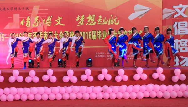 表彰大会结束后,充满活力的藏族舞《喜相会》拉开“情系博文 梦想起航”毕业生文艺晚会的序幕,晚会节目内容丰富多彩,现代舞《Hot Pink》、《RHYTHM TA》,歌曲《感谢》、《爱因为在心中》,相声《青春逗趣》以及《棍舞乾坤》等节目,不仅表演精彩,而且体现了我院大学生良好的精神风貌,表演牵动着每一位观众的心,引起了阵阵喝彩。