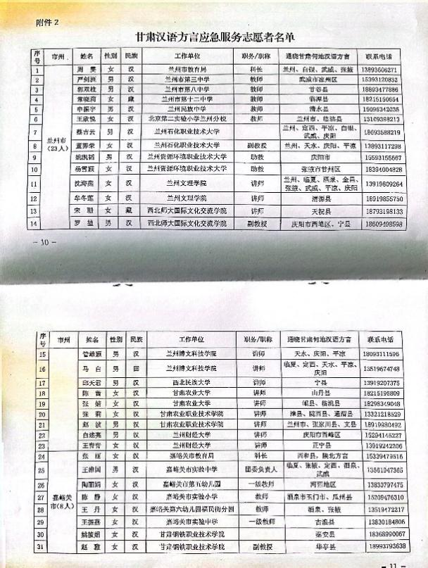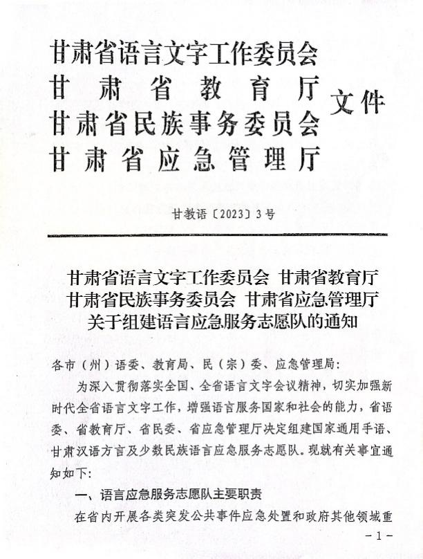 根据《国务院办公厅关于全面加强新时代语言文字工作的意见》“建立语言服务机制,建设国家语言志愿服务队伍”的有关要求,省语委、省教育厅、省民委、省应急管理厅发出通知,面向全省各行各业招募国家语言志愿者。经个人自愿申请,各市(州)及有关高校推荐,省语委等部门认真遴选,首批语言应急服务志愿队共231名成员,其中甘肃省国家通用手语应急服务志愿队77名,甘肃汉语方言应急志愿队83名,甘肃少数民族语言应急服务志愿队71名。甘肃省语委、省教育厅、省民委、省应急管理厅向志愿者颁发证书。
