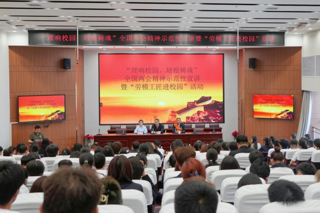 为深入学习领会习近平总书记在全国两会期间发表的一系列重要讲话精神以及全国两会审议通过的报告和文件精神,根据省委教育工委、省总工会有关要求, 5月17日,学校举办“理响校园·培根铸魂”全国两会精神示范性宣讲暨“劳模工匠进校园”活动。本次活动共有三名宣讲人在不同的角度,讲述了他们立足岗位、攻坚克难、在平凡岗位上谱写奋斗人生的感人故事,两百余名师生代表现场聆听。