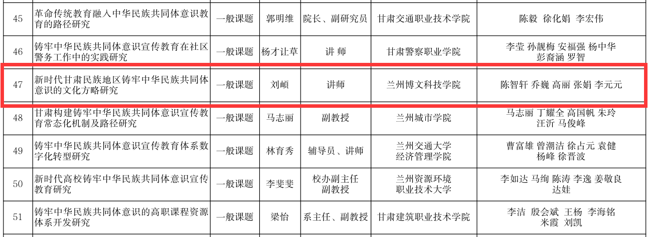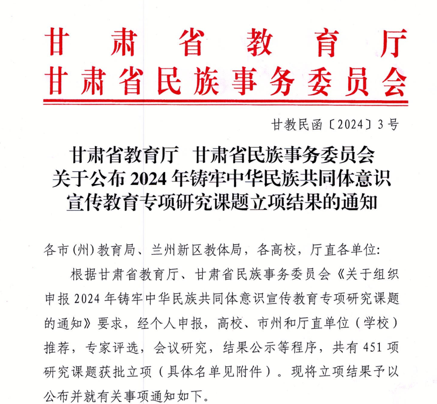 近日,甘肃省教育厅、甘肃省民族事务委员会下发了《关于公布2024年铸牢中华民族共同体意识宣传教育专项研究课题立项结果的通知》(甘教民函〔2024〕3号)文件,我校申报的两个课题获批立项,其中一项是省内同类院校中唯一获批的重点课题。