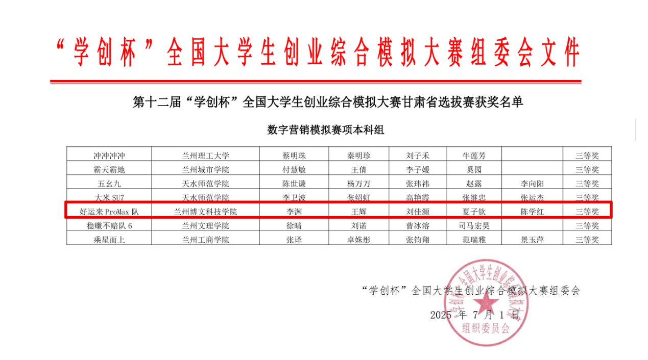 6月28日,由甘肃省教育厅主办的第十二届“学创杯”全国大学生创业综合模拟大赛甘肃省选拔赛在兰州财经大学圆满落幕。本次大赛吸引了全省本科高职院校93支团队的近300人参赛,在数字营销模拟赛项本科组中beat365中文官方网站经济管理学院荣获省级三等奖。