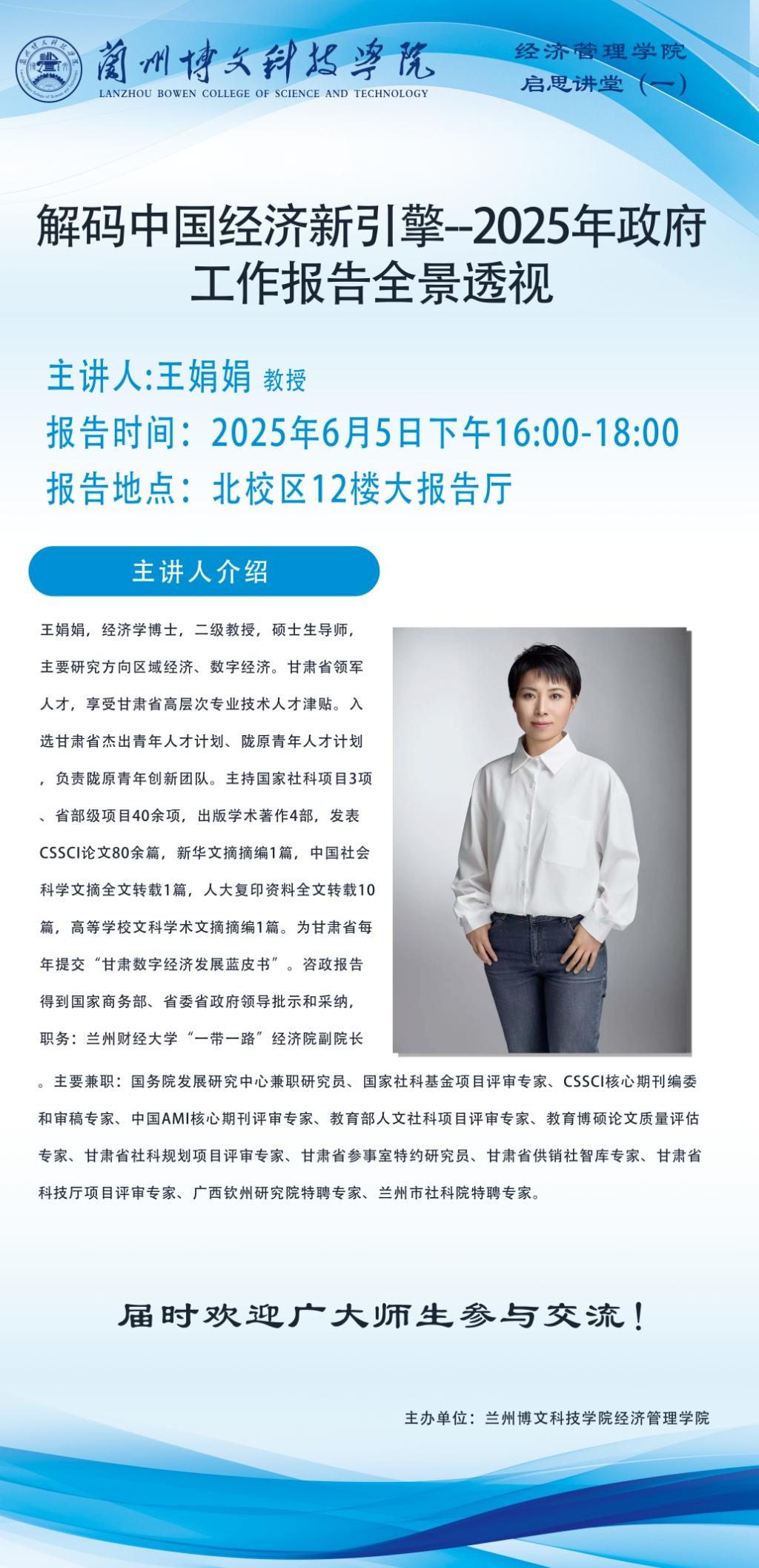 6月5日下午,学校经济管理学院特邀兰州财经大学教授、经济学博士王娟娟,在综合教学楼学术报告厅开展题为“解码中国经济新引擎——2025年政府工作报告全景透视”的主题讲座。