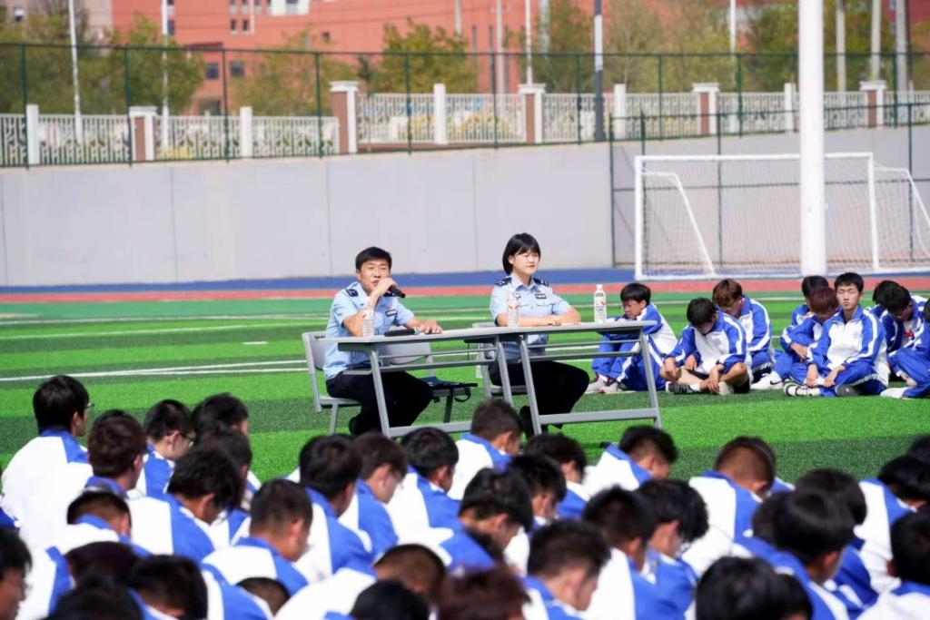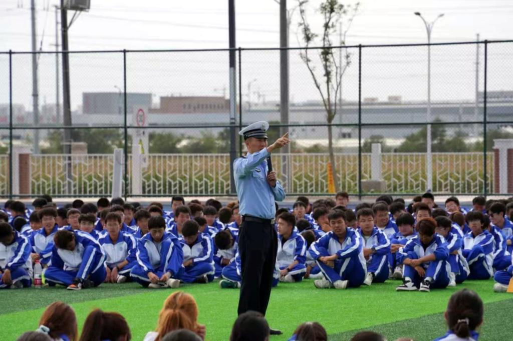 9月9日下午,beat365中文官方网站新区校区在田径场面向2025级新生举办“安全教育第一课”活动。本次活动特邀兰州新区公安局刑事技术大队大队长陆林、禁毒大队警官魏青和交警大队警官任文武作专题宣讲,围绕“防诈骗、拒毒品、守交规”三大主题,助力新生增强安全意识、适应校园生活。