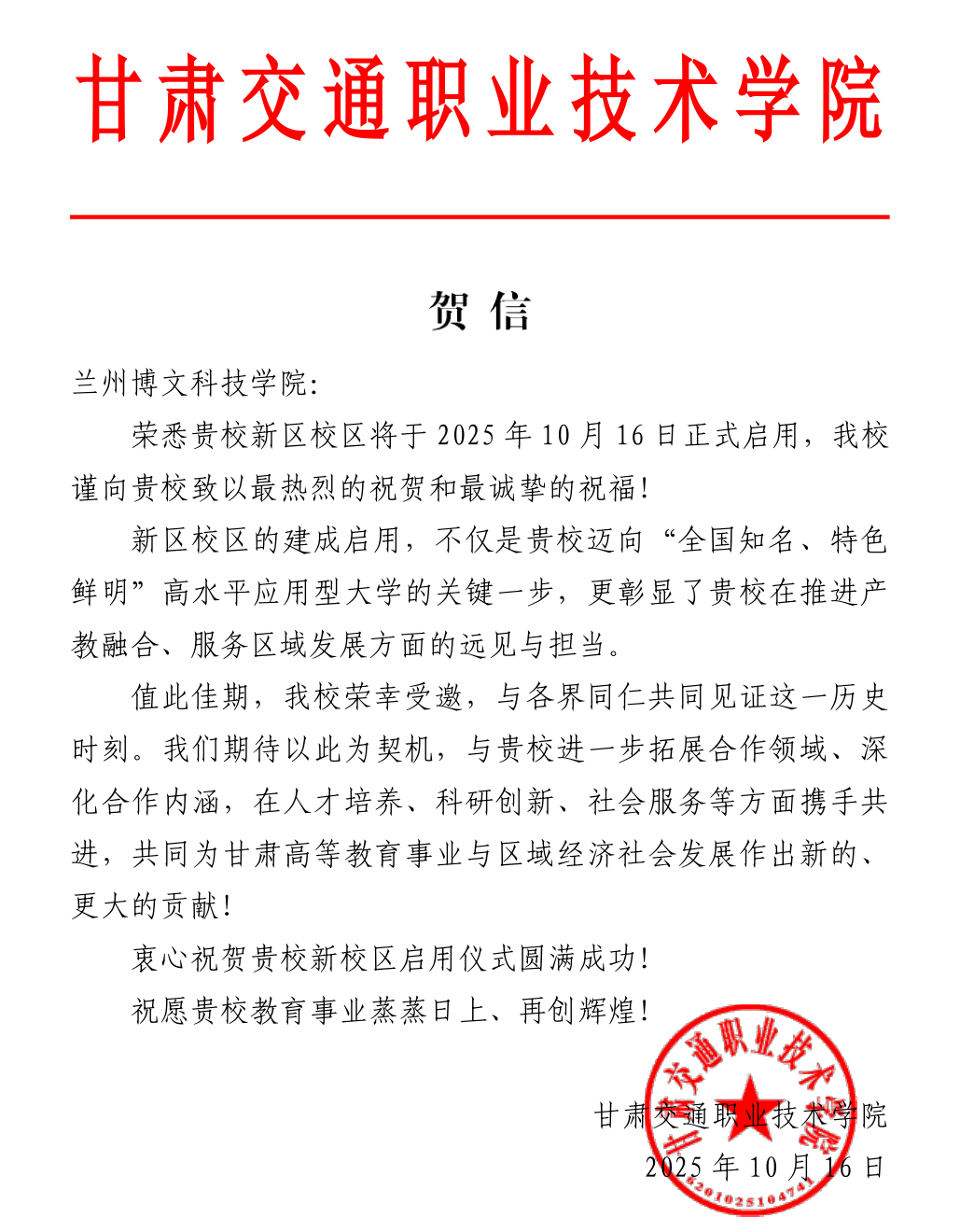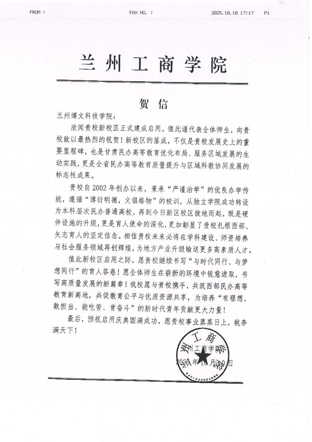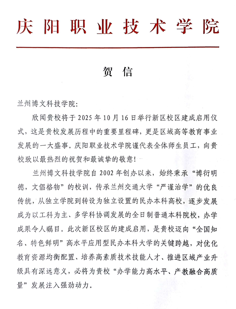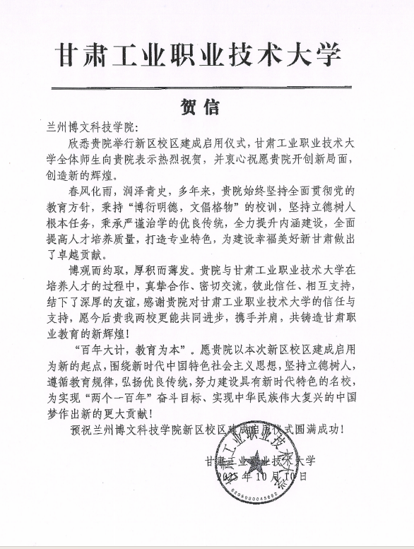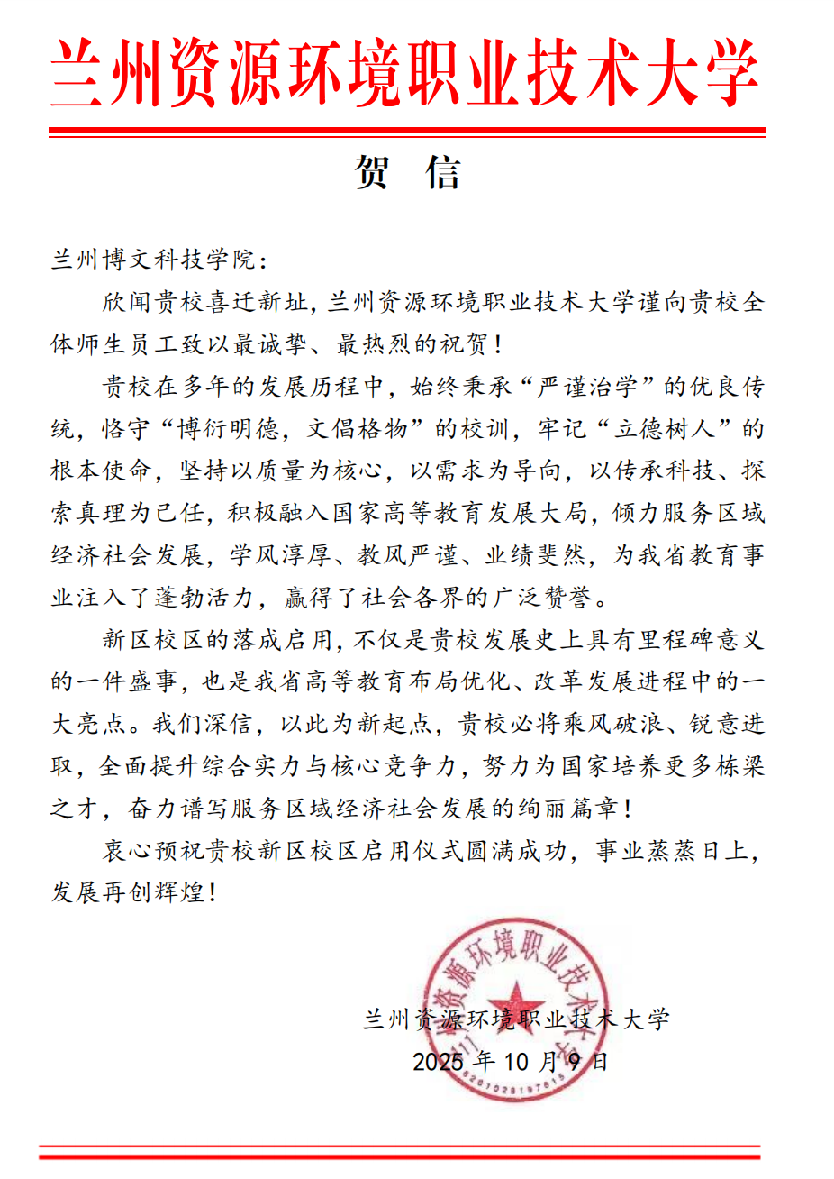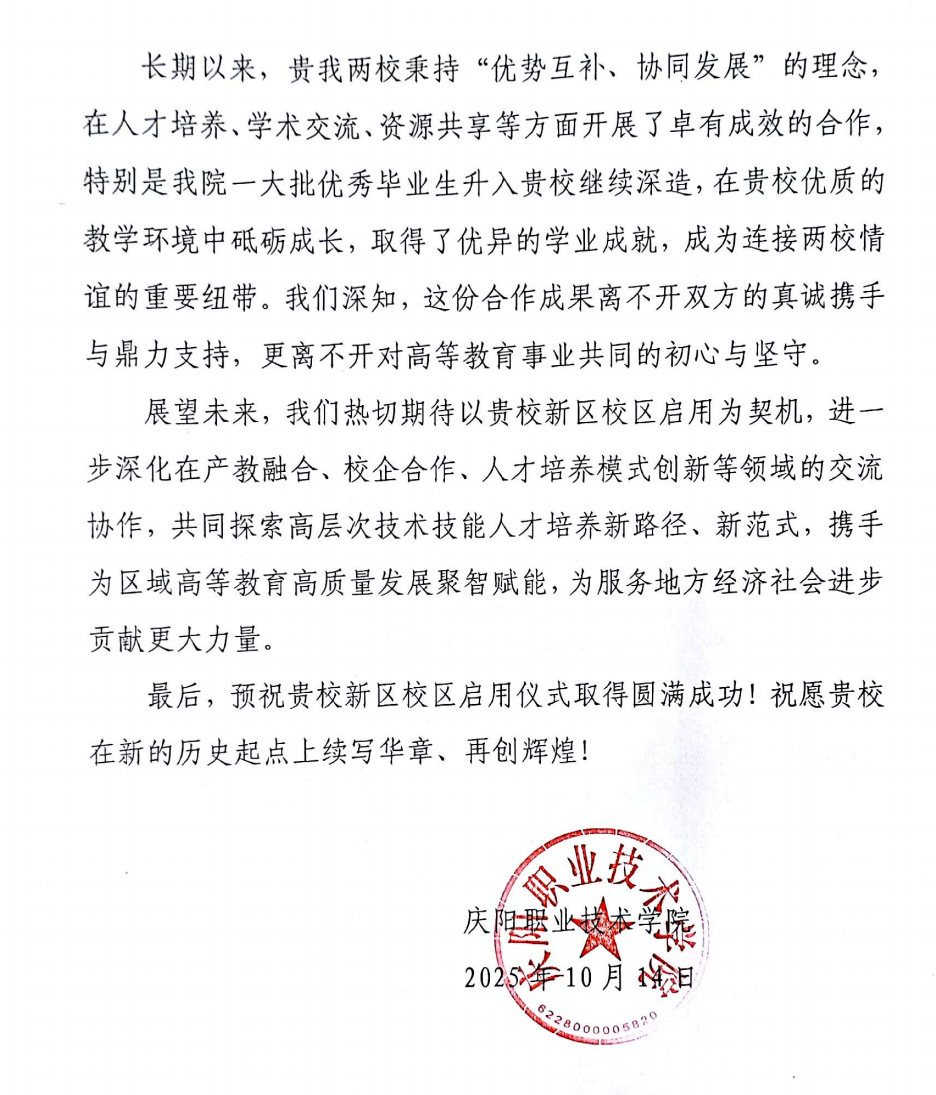 各高校在贺信中一致表达了对beat365中文官方网站新区校区顺利启用的热烈祝贺与美好祝愿。各高校均期待以此为契机,未来能在学科建设、人才培养及科研创新等领域,与beat365中文官方网站进一步深化交流,拓展合作空间,携手为高等教育事业的高质量发展贡献力量。