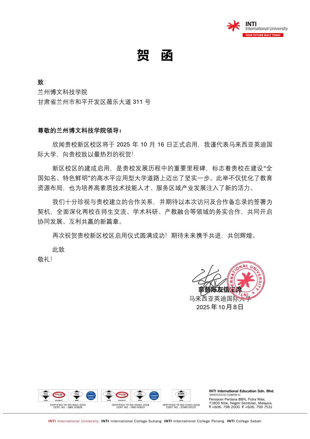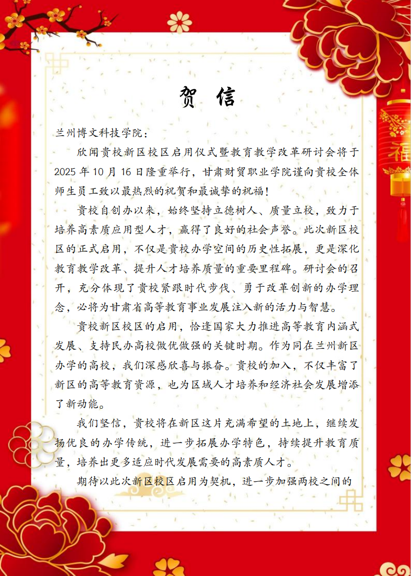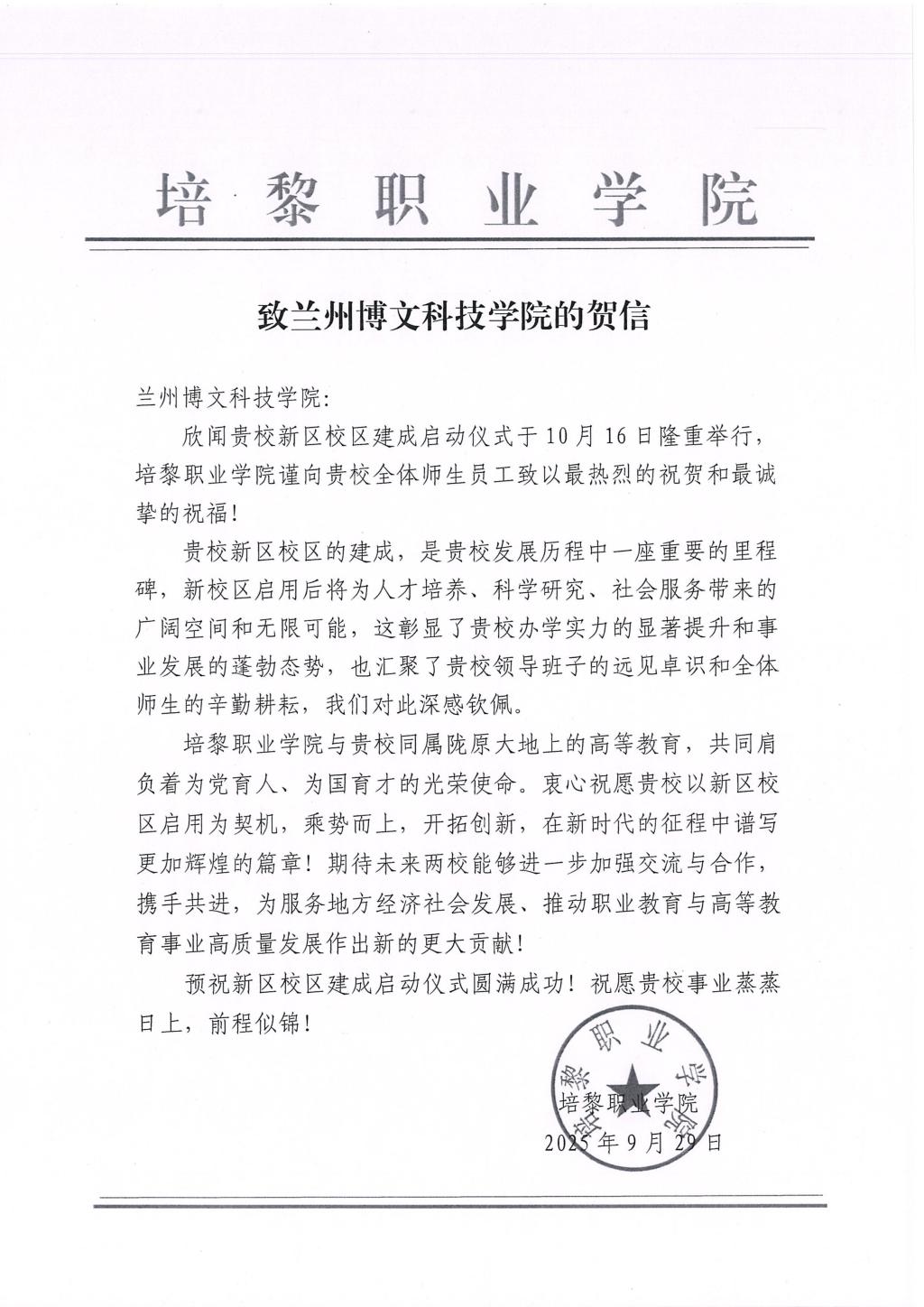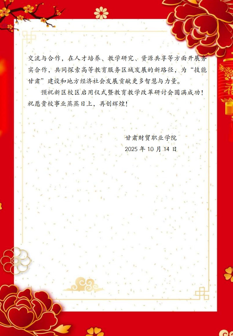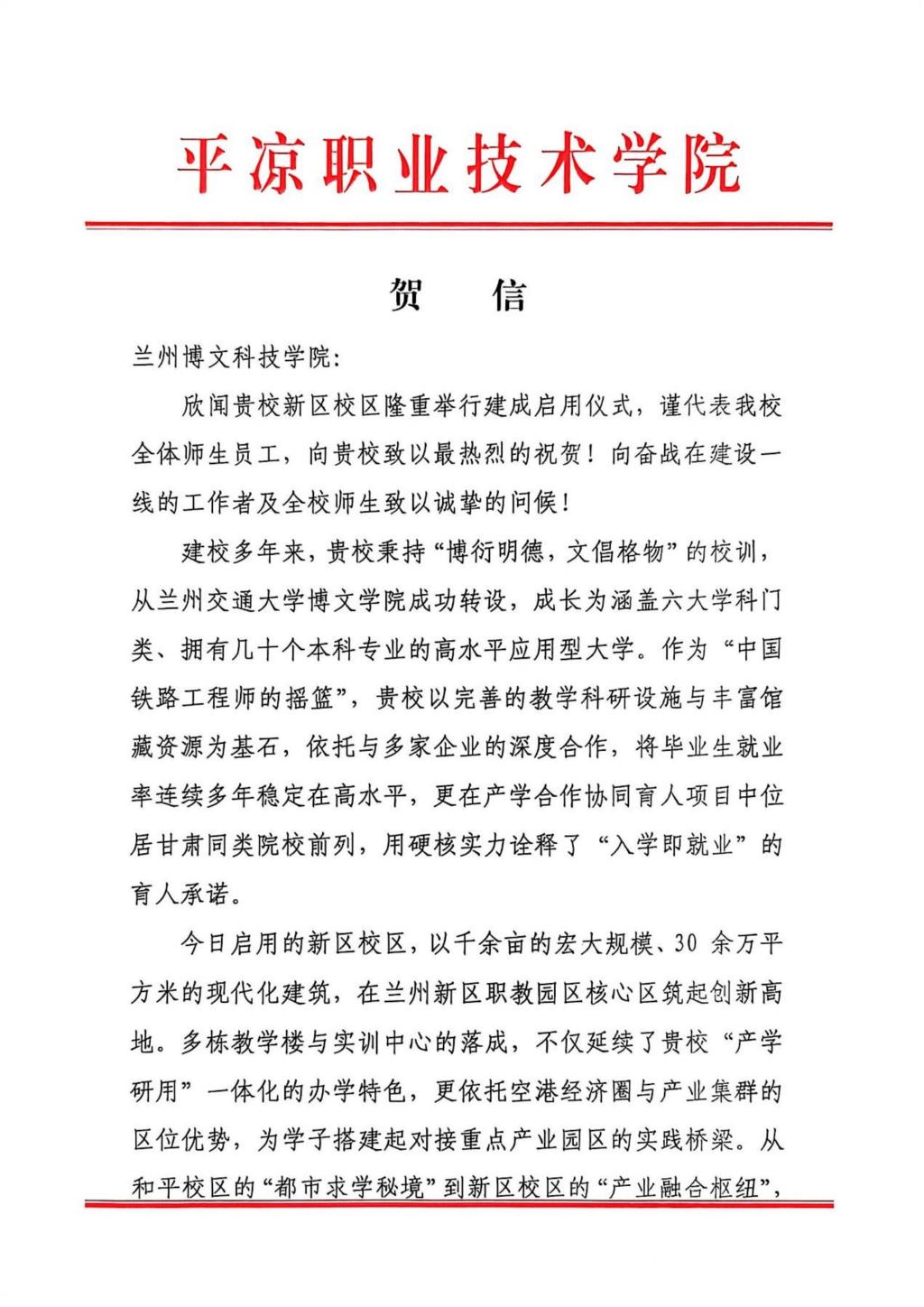 各高校在贺信中一致表达了对beat365中文官方网站新区校区顺利启用的热烈祝贺与美好祝愿。各高校均期待以此为契机,未来能在学科建设、人才培养及科研创新等领域,与beat365中文官方网站进一步深化交流,拓展合作空间,携手为高等教育事业的高质量发展贡献力量。