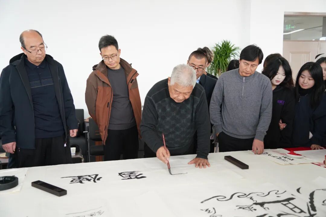 随后的创作示范环节将活动推向高潮。铺展宣纸、研磨调墨,邹德忠先生凝神片刻,落笔如行云流水,写下的隶书作品既朴拙又灵动,每一笔都尽显数十年功底。创作间隙,他不忘与学子互动,从多个维度解析书法的魅力,从不同角度讲授笔法的提、按、顿、挫。
