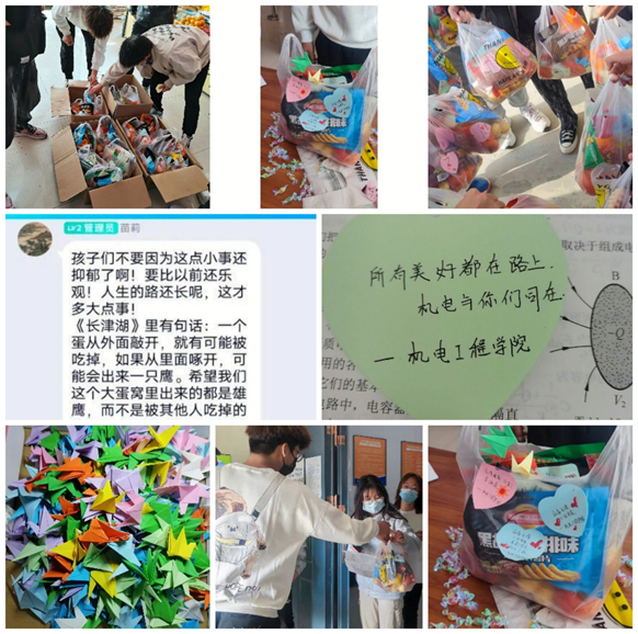 自学校施行封闭式管理以来,面对严峻的疫情防控形势,特别是八号公寓成为全校的焦点,面对处在八号公寓的本院女生,本院领导主动协调并通过QQ、微信等通讯软件对八号公寓的“机电人”进行慰问。主动了解困难以及生活所需,同时开展心理疏导工作,在多方的相互协调下,在本院全体师生的共同努力下,八号公寓完成了多次核酸检测,并在校领导的统一指挥下,本院辅导员深入八号公寓,为她们发放由校董事会提供的防疫物资,将校董事会的热情传递到了每一个“机电人”身上。同时,在本院领导的统一指挥下本院也开展了“疫”中有情送温暖活动,并取得了机电学子的强烈响应。