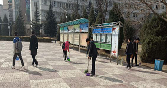 随后,支部全体党员和入党积极分子来到南校区教学楼前。分成三个小组,以饱满的热情投入到此处志愿服务活动中。第一组走进教学楼1楼各教室,对黑板、桌椅进行了细致地清洁,为同学们营造一个更加舒适的学习环境;第二组拿着准备好的铲子、抹布,对教学楼两侧宣传栏进行彻底清洗;第三组仔细清理草坪、路面上的垃圾;各组党员分工明确,以实际行动展现大家自觉维护校园环境卫生。