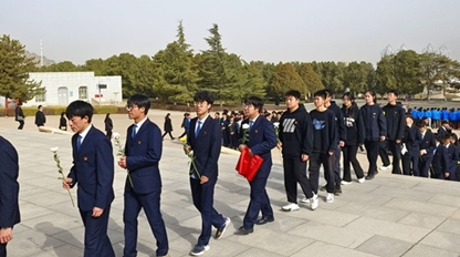 紧跟着的老师们和学生代表怀着无比崇敬的敬畏之心整理花篮缎带,青年学生们依次列队敬献鲜花并瞻仰革命烈士纪念碑。