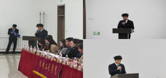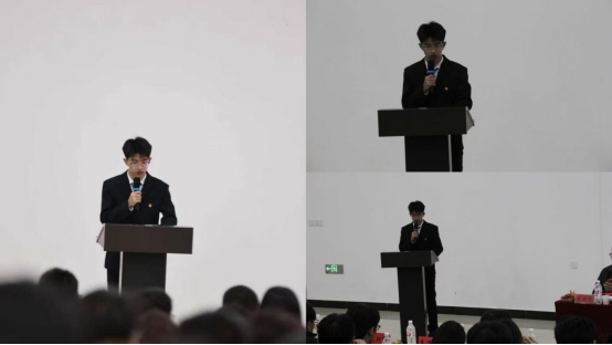 第六届团总支学生会副书记、执行主席王杰作就职报告。他身着正装,精神饱满地向全体参会人员表达诚挚感谢,表示将牢记老师和同学们的信任与嘱托,带领新一届团总支学生会全体成员,不忘初心、牢记使命,奋力开创学院团学工作新局面。