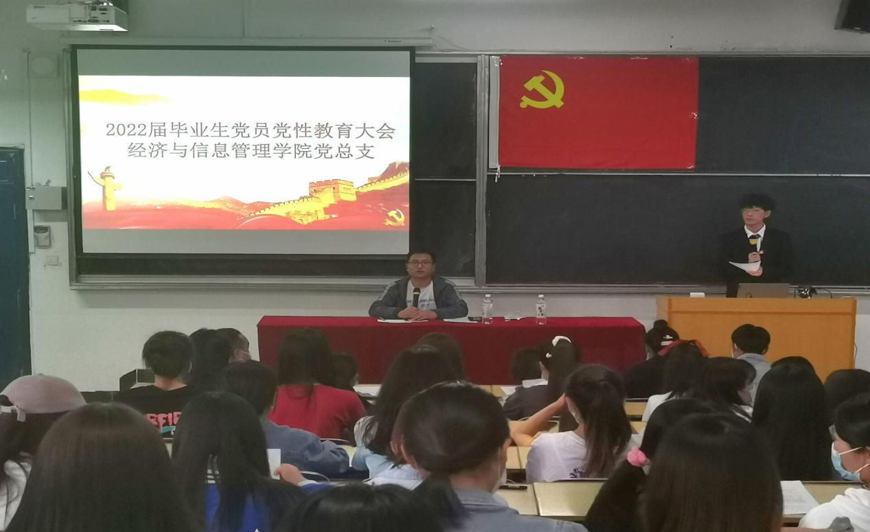 为进一步做好2022届毕业生党员党性教育管理工作,强化党员意识,严明党风纪律,提升党员素质,切实发挥党员的先锋模范作用,引导和激励广大毕业生党员坚定理想信念,以饱满的热情走向新的学习征途和工作岗位,经济与信息管理学院党总支于2022年5月25日晚19点在教学楼东T4教室召开了2022届毕业生党员党性教育大会。此次会议由经济与信息管理学院党总支副书记赵磊老师主持召开,全体毕业生党员参加会议。