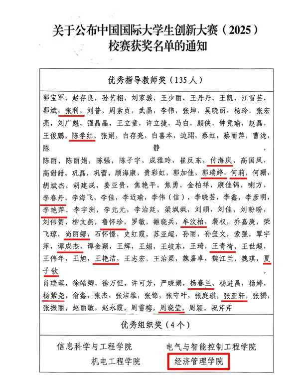 本次中国国际大学生创新大赛(2025)校赛,坚守“以赛促学、以赛促教、以赛促创”的教育理念。大赛自启动以来,共征集项目525项,累计吸引3387人次学生参赛,为全校学子搭建了展现创新能力、实践能力与协作能力的优质平台,助力推动学校创新创业教育高质量发展,为培养“大众创业、万众创新”主力军奠定坚实基础。经过激烈的角逐和严格的评审,经济与信息管理学院凭借出色的组织工作荣获了优秀组织奖。这是对学院创新创业教育工作的充分肯定和高度评价,也是对学院师生辛勤付出的最好回报。