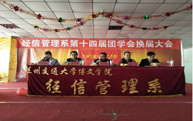 2017年11月10日中午12:30,经信管理系第十四届团学会换届大会在新校区体育馆301教室隆重举行。出席本次大会的领导及嘉宾有经信管理系学生管理副主任宋国军、教学管理副主任张德江、经信管理系团总支书记赵磊、团总支副书记张燕、我系李岩老师、我院各社团负责人以及我系第十三届团学会主席团成员。