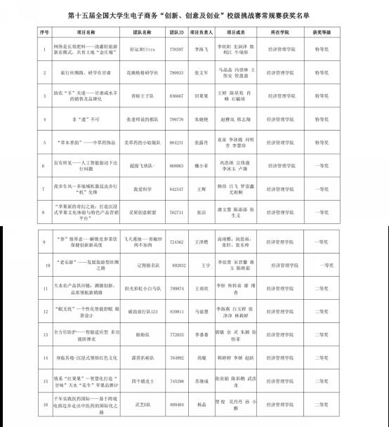 2025年6月22日,第十五届全国大学生电子商务“创新、创意及创业”挑战赛(简称“三创赛”)甘肃赛区选拔赛在兰州财经大学和平校区圆满落幕。我院学子在此次竞赛中表现卓越,收获颇丰!共斩获“最佳创新奖”1项,省级二等奖两项,校级特等奖5项、一等奖5项、二等奖6项。