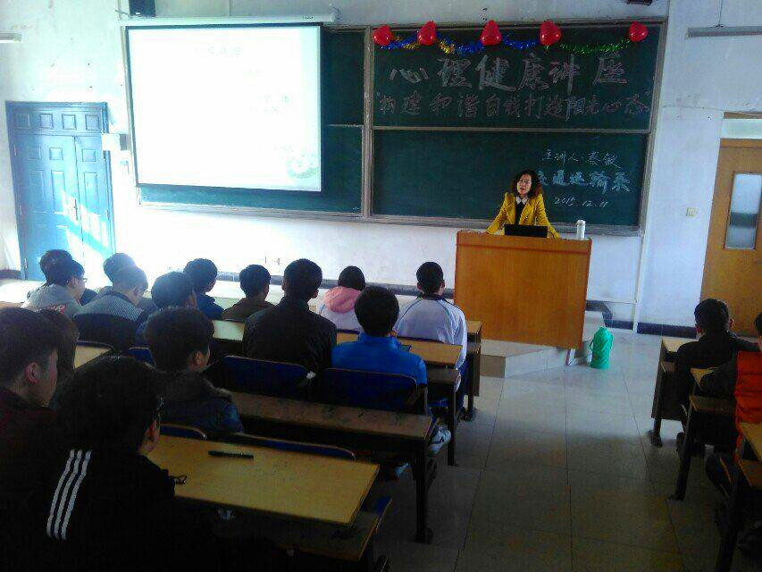 为响应甘肃省教育厅关于大学生思想政治教育百千万工程,兰州交通大学博文学院交通运输系于2015年12月11日14点30分在教学楼东T1举行了“心理健康知识讲座”。本次讲座的讲师为我院心理咨询师蔡敏老师。参加这次讲座的还有交通运输系学生管理副主任梁婷婷、我系部分老师以及14级全体同学。