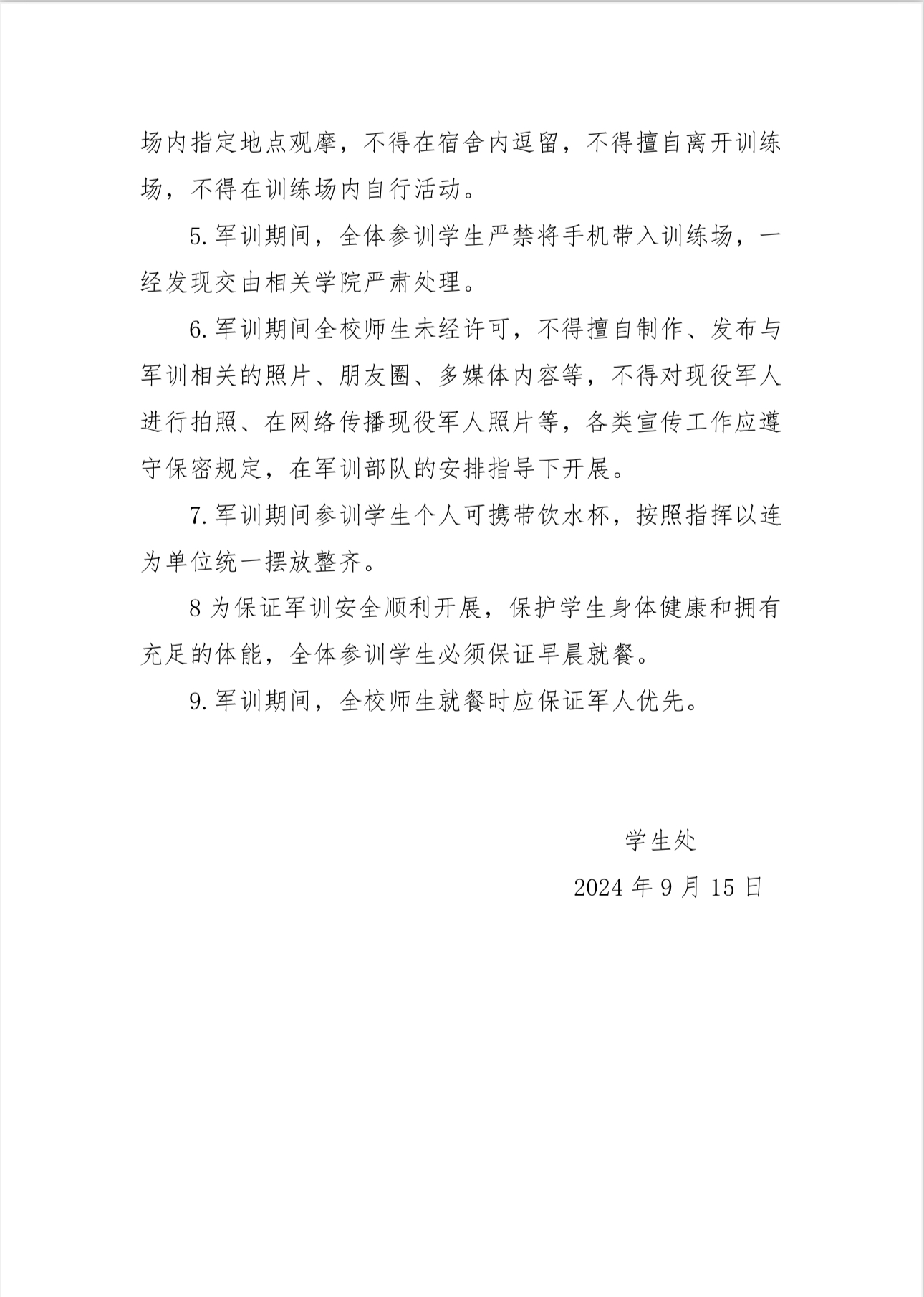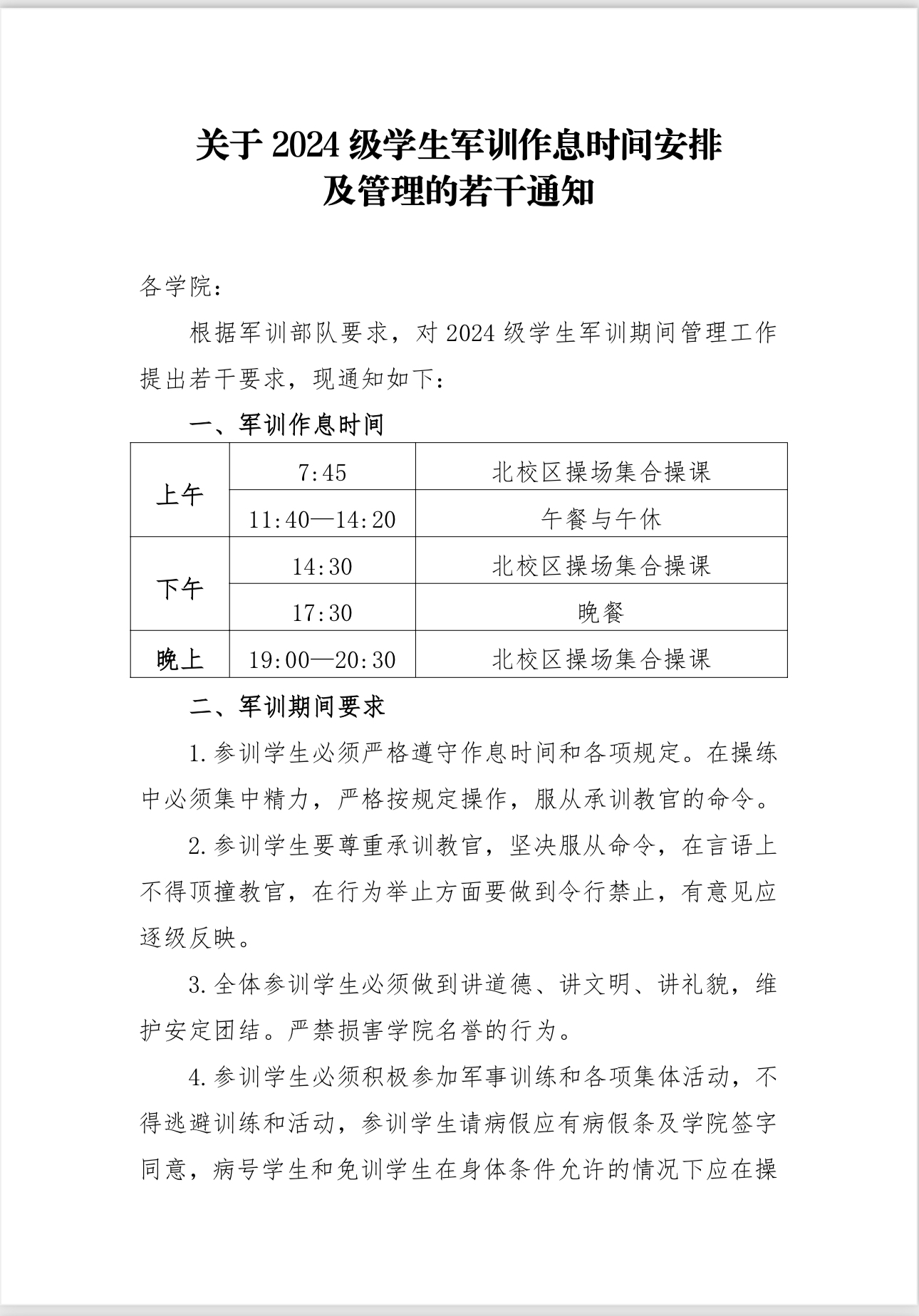 关于24级学生军训作息时间安排及管理的若干通知