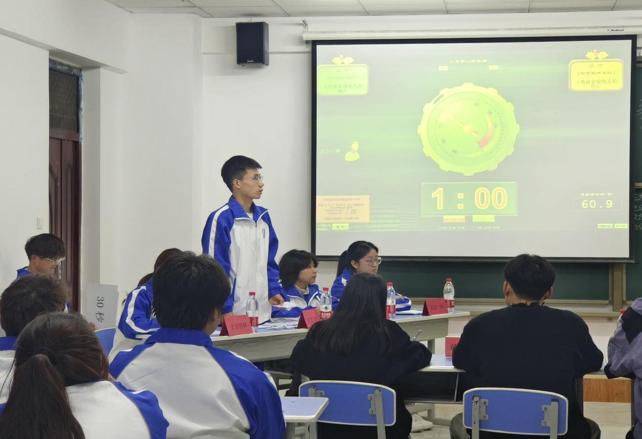 本届辩论赛初赛在各位选手的精彩辩论和评委老师的公正评判下圆满结束,为此次辩论赛创造了良好的开端,也让晋级的班级坚定信心迎接之后的比赛。在之后的半决赛中,选手们在有限的时间内对“熬夜是当代人的病还是药”“与谁同行更重要还是去往何处更重要”等辩题做了充分准备。相较于初赛,半决赛中选手的表现更加精彩。选手们思路清晰,字字珠玑,双方辩手互不相让,立足己方观点。赛场气氛紧张激烈,充分展现了双方辩手对于辩题的深入思考和充分准备。
