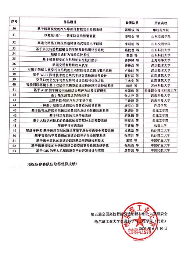 2021年6月20日,由中国自动化学会与全国交通设备与控制工程专业联盟主办,哈尔滨工业大学承办的“龙江交投杯”第五届全国高校智能交通创新与创业大赛在哈尔滨成功举办,我系代表队取得了一项二等奖的好成绩。