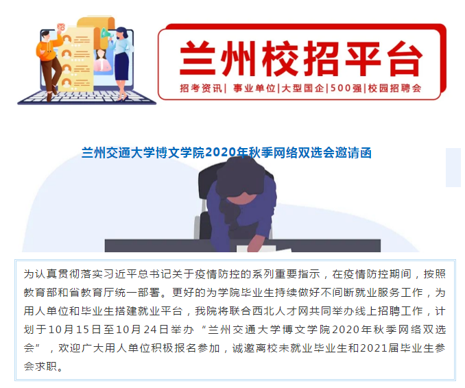 (一)登录“兰州交通大学博文学院招生就业网http://jiuye.bowenedu.cn/或登录 “西北人才网”http://www.xbrc.com.cn/点击“兰州交通大学博文学院2020年秋季网络双选会”链接,根据网页指引投递简历。