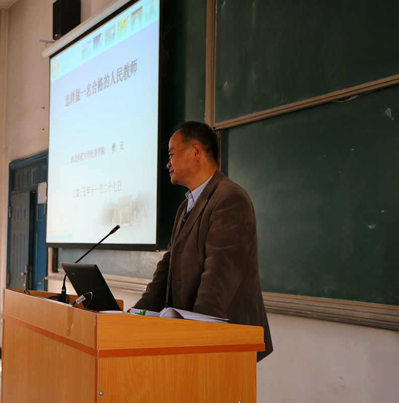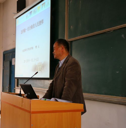 11月27日,我院省内客座教授——西北师范大学樊元教授应邀来我院做了“怎样做一名合格的人民教师”的学术报告。报告由教务处郭斌处长主持。王西林副院长、学院各系(部)的教学和管理人员参加了本场报告会。