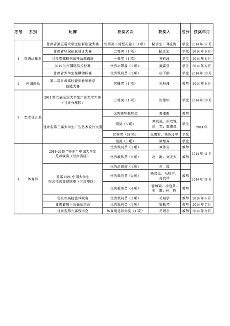 兰州交通大学博文学院2014年各系部师生院外获奖情况统计表