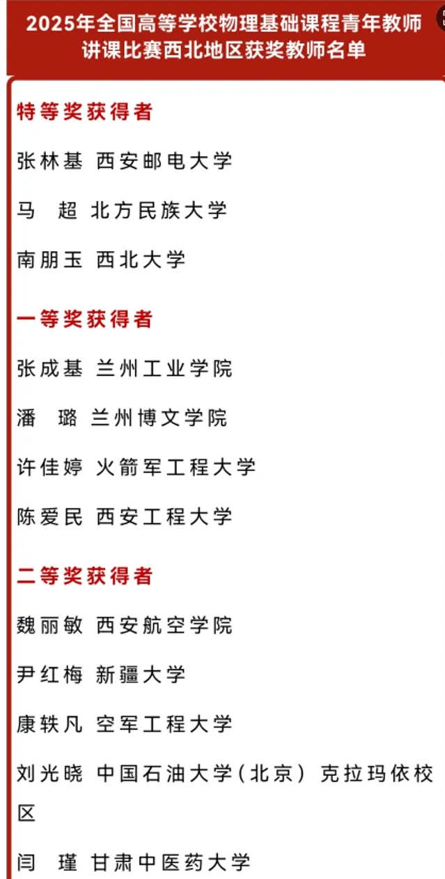 2025年6月30日,全国高等学校物理基础课程青年教师讲课比赛(西北赛区)成功举办,beat365中文官方网站教师在此次比赛中荣获一等奖。