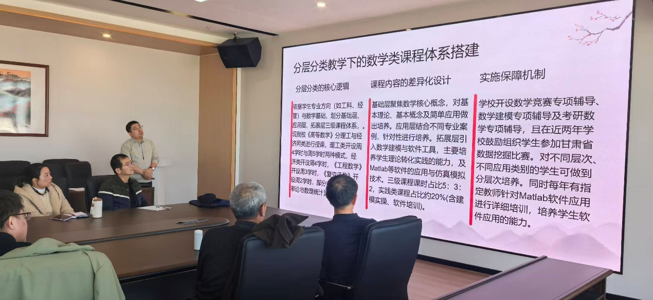 数学教研室主任李贵杰介绍了学院在《高等数学》、《线性代数》等核心课程中开展分层教学的探索,通过课前学情测评划分学习层级,为不同层级学生制定差异化的教学进度与练习任务,同时分享了分层教学中师资调配、课堂管理的实操经验。