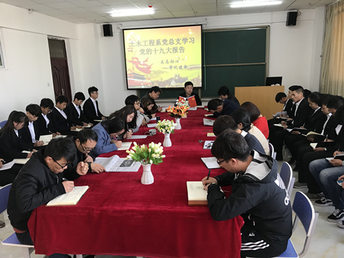 2017年11月8日,兰州交通大学博文学院土木工程系党总支在综合教学楼1108教室召开“学习党的十九大报告”专题会议。参加本次会议的有土木工程系党总支书记黄钰峰、土木工程系党总支副书记王俊鹏、教工党员以及全体学生党员。