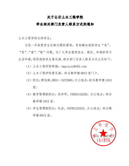 关于公示土木工程学院 学生相关部门负责人联系方式的通知