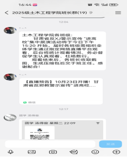 为深入贯彻落实反邪教警示教育工作要求,切实提升全校学生识邪、辨邪、拒邪能力,筑牢校园思想安全防线,10月23日下午15:20,土木工程学院严格按照上级部署,组织全体学生通过视听甘肃 APP、陇原剑平台、甘肃卫视视频号/微博及《法治伴你行》视频号等指定网络直播渠道,集中观看甘肃省反邪教警示宣传“进高校”集中展演活动(第一站・兰州交通大学礼堂)。活动后台实时统计观看数据,土木工程学院班主任、团学会同步强化督促引导,确保学生全程认真参与、学有所获,杜绝敷衍观看现象。