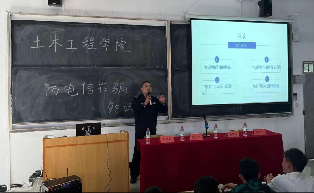 为进一步提高我院学生的网络电信诈骗识别和防范能力,维护同学们的切身利益,预防各类网络电信诈骗事件,营造和谐平安的校园环境。4月18日下午,土木工程学院在教学楼西T4开展防范电信诈骗知识专题讲座,教学楼西T4同步进行线上直播,此次讲座特邀榆中县公安局反诈中心陈冠宇警官主讲,土木工程学院全体学生参加。