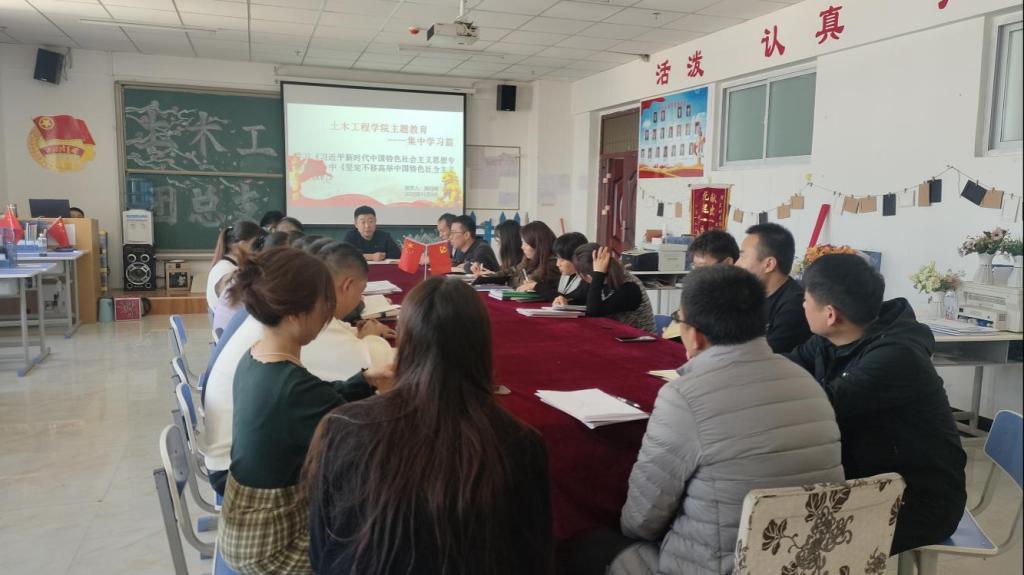 为深入开展学习贯彻习近平新时代中国特色社会主义思想主题教育,使主题教育学习走深走实,根据《土木工程学院关于深入开展学习贯彻习近平新时代中国特色社会主义思想主题教育的实施方案》内容,2023年11月19日土木工程学院党委书记,院长黄钰峰组织全体教师集中学习《习近平新时代中国特色社会主义思想专题摘编》中《坚定不移高举中国特色社会主义伟大旗帜》