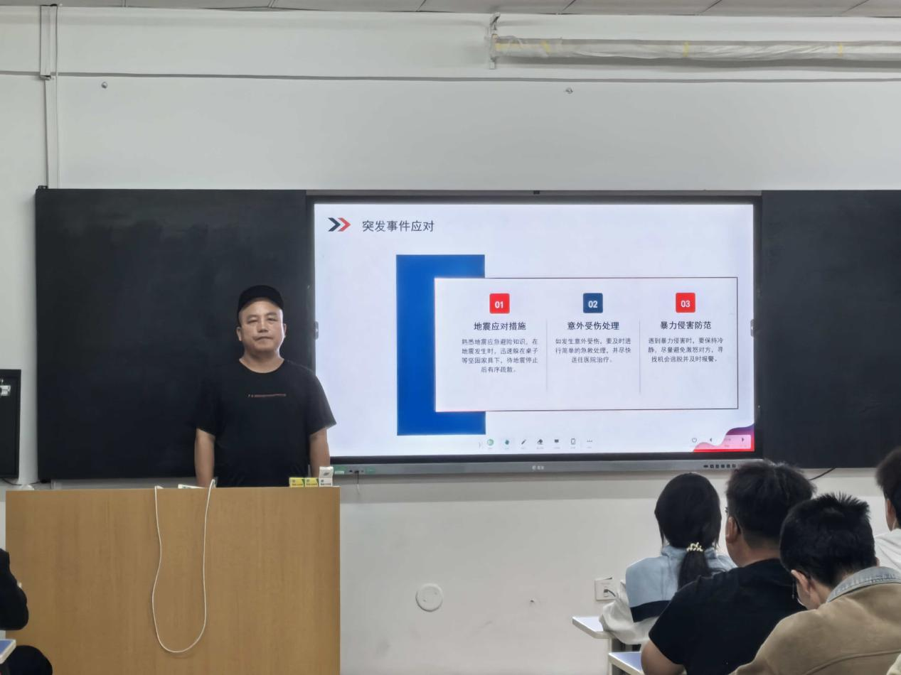 会议围绕人身安全、个人财物安全、消防安全及用电安全四大板块展开系统讲解。在人身安全教育方面,王路清老师强调了宿舍和谐、规律作息和自我保护意识的重要性,鼓励同学们文明交往、互助友爱,遇到矛盾理性沟通。另外,在突发事件应对方面,他还讲解了地震避险、意外受伤处理、暴力侵害防范等实用知识,并呼吁同学们关注心理健康,学会情绪调节,遇到困难主动寻求帮助。