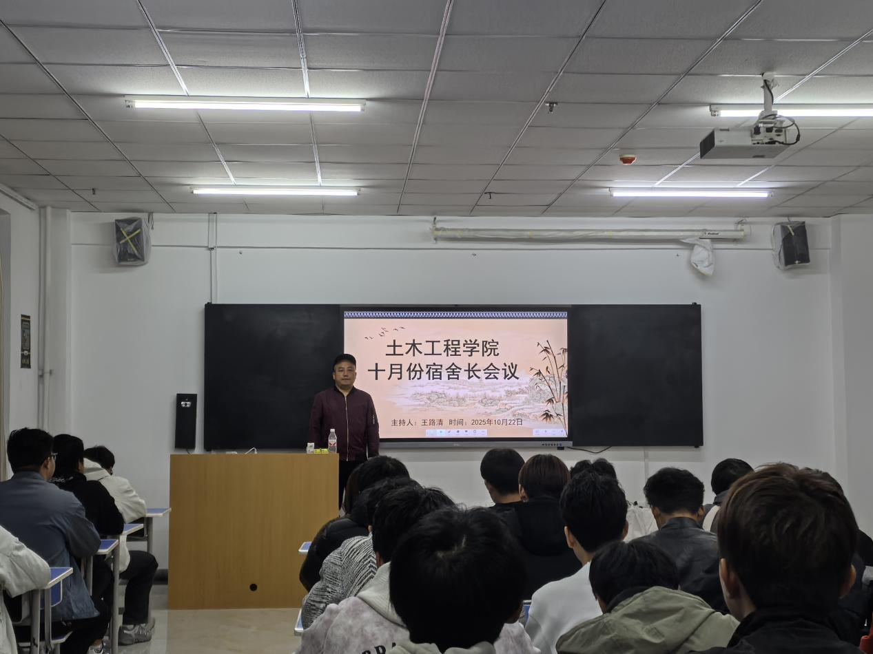 2025年9月22日19:30,为进一步加强学生公寓管理,土木工程学院于综合教学楼1004教室召开以“共建文明寝室,营造和谐公寓”为主题的宿舍长会议。此次会议由辅导员王路清老师主持,土木工程学院全体宿舍长参加。