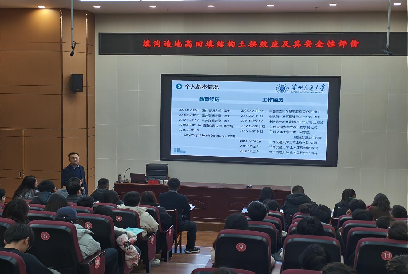 为破解黄土地区填沟造地工程技术难题,助力师生了解岩土工程领域前沿动态,营造浓厚学术研究氛围,推动学科专业高质量发展,2025年11月19日下午,土木工程学院联合教务处特邀兰州交通大学博士生导师李盛教授,在北校区综合教学楼小报告厅作题为《填沟造地高回填结构土拱效应及其安全性评价》的专题讲座。讲座由土木工程学院院长黄钰峰主持,学院师生代表共同参与了本次学术活动。