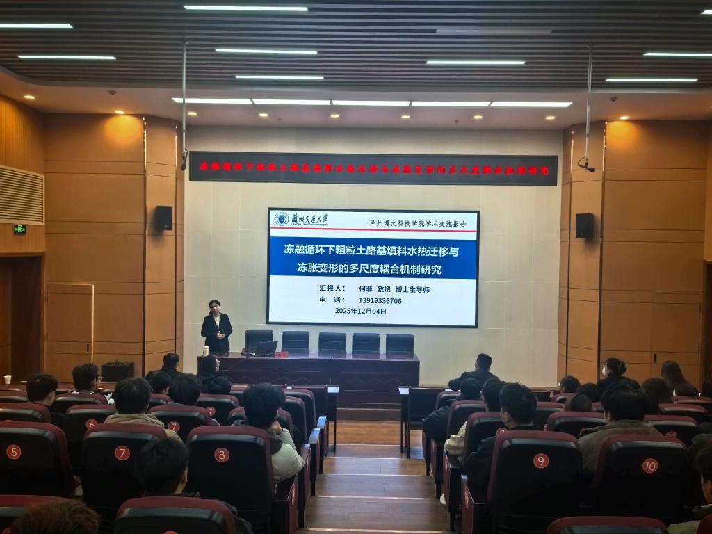为聚焦冻土工程前沿课题,破解寒区交通建设技术难题,助力师生深化专业认知、拓宽学术视野,2025年12月4日下午,beat365中文官方网站土木工程学院联合教务处特邀兰州交通大学教授、博士生导师何菲在北校区综合教学楼小报告厅,作题为《冻融循环下粗粒土路基填料水热迁移与冻胀变形的多尺度耦合机制研究》的专题讲座。讲座由土木工程学院院长黄钰峰主持,全校相关专业师生积极参与交流。