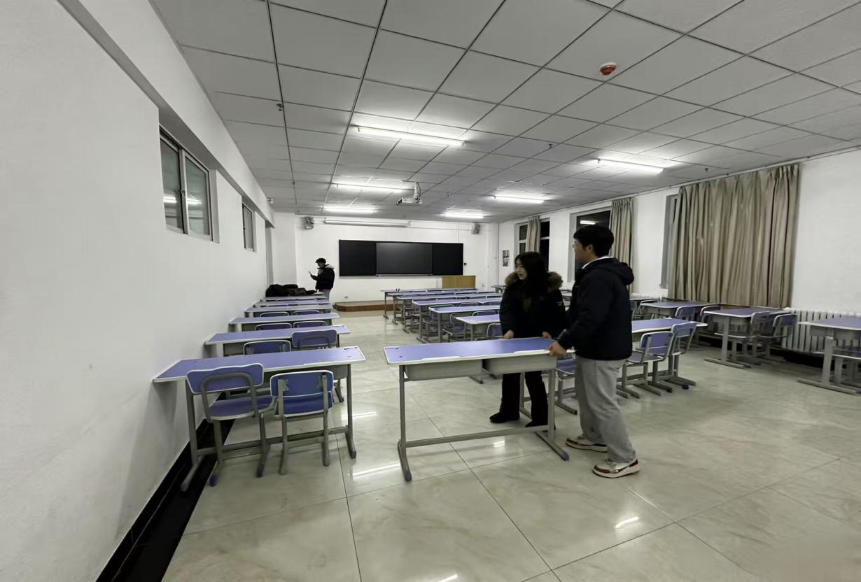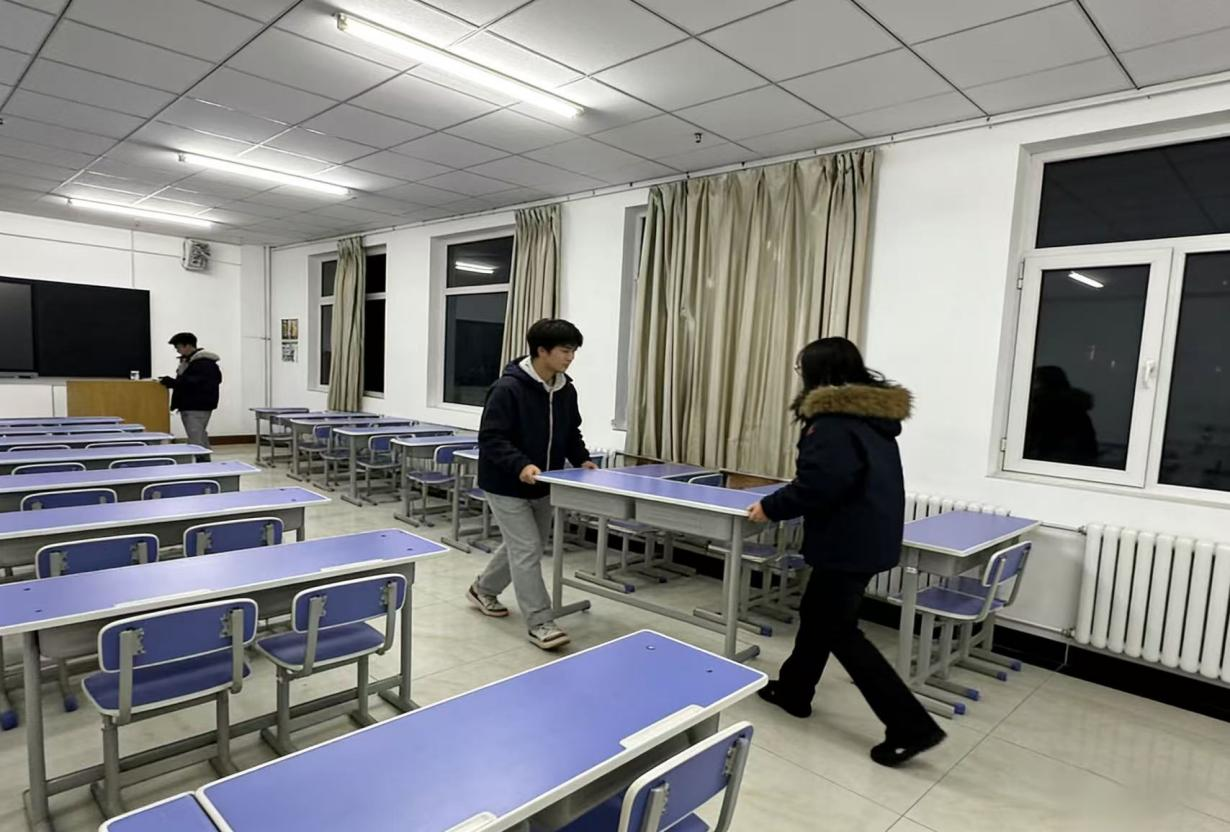 凛冽的寒风挡不住大家的热情,土木工程学院学子们忙碌的身影成为校园里一道温暖的风景线。经过数小时的细致劳作,所有考场均达到“干净整洁、设施齐全、标识清晰”的标准,为考生打造了舒适安心的应考空间。此外,土木工程学院还通过校园公告栏、班级群等渠道发布考试注意事项,提醒考生携带证件、遵守考纪,同时在考场周边设置指示牌,安排专人引导考生入场,全力做好考试服务保障工作。