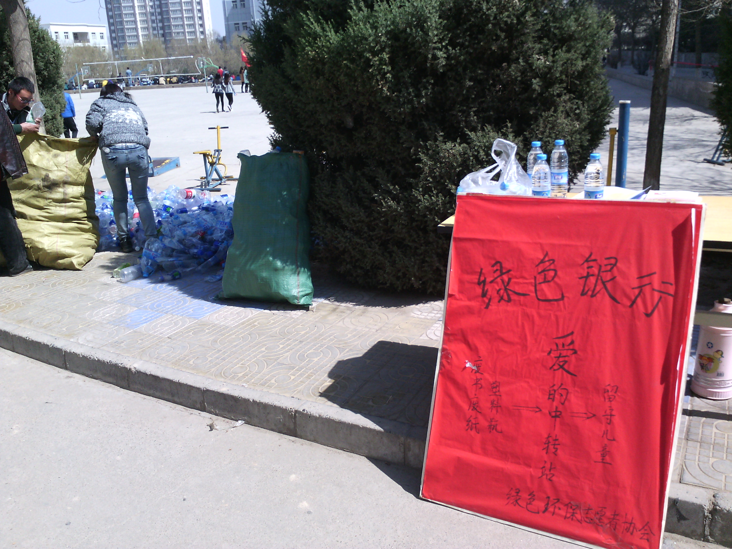 2015年3月24日和25日中午,绿色环保志愿者协会于兰州交通大学博文学院举行了“绿色银行”活动。此次活动以回收塑料瓶和废旧纸的形式为生活贫困的留守儿童们募集资金,为他们添置生活用品和学习用品。经过绿色环保志愿者协会的绿精灵们的大力宣传和努力之后,我们一共收获了8000多个塑料瓶。也让作为“爱的中转站”的绿色环保志愿者协会为留守儿童们尽了自己的一份绵薄之力。绿色、环保、爱心,我们一直在行动!