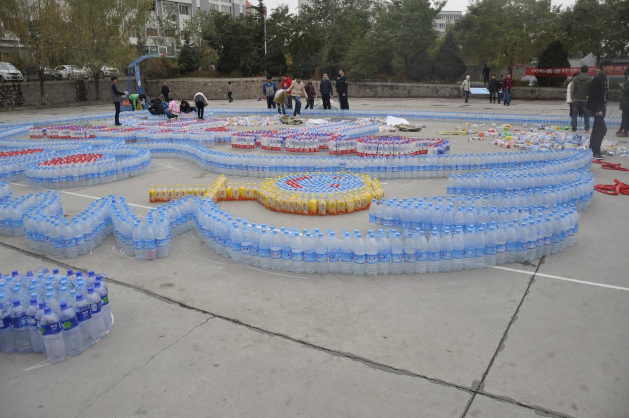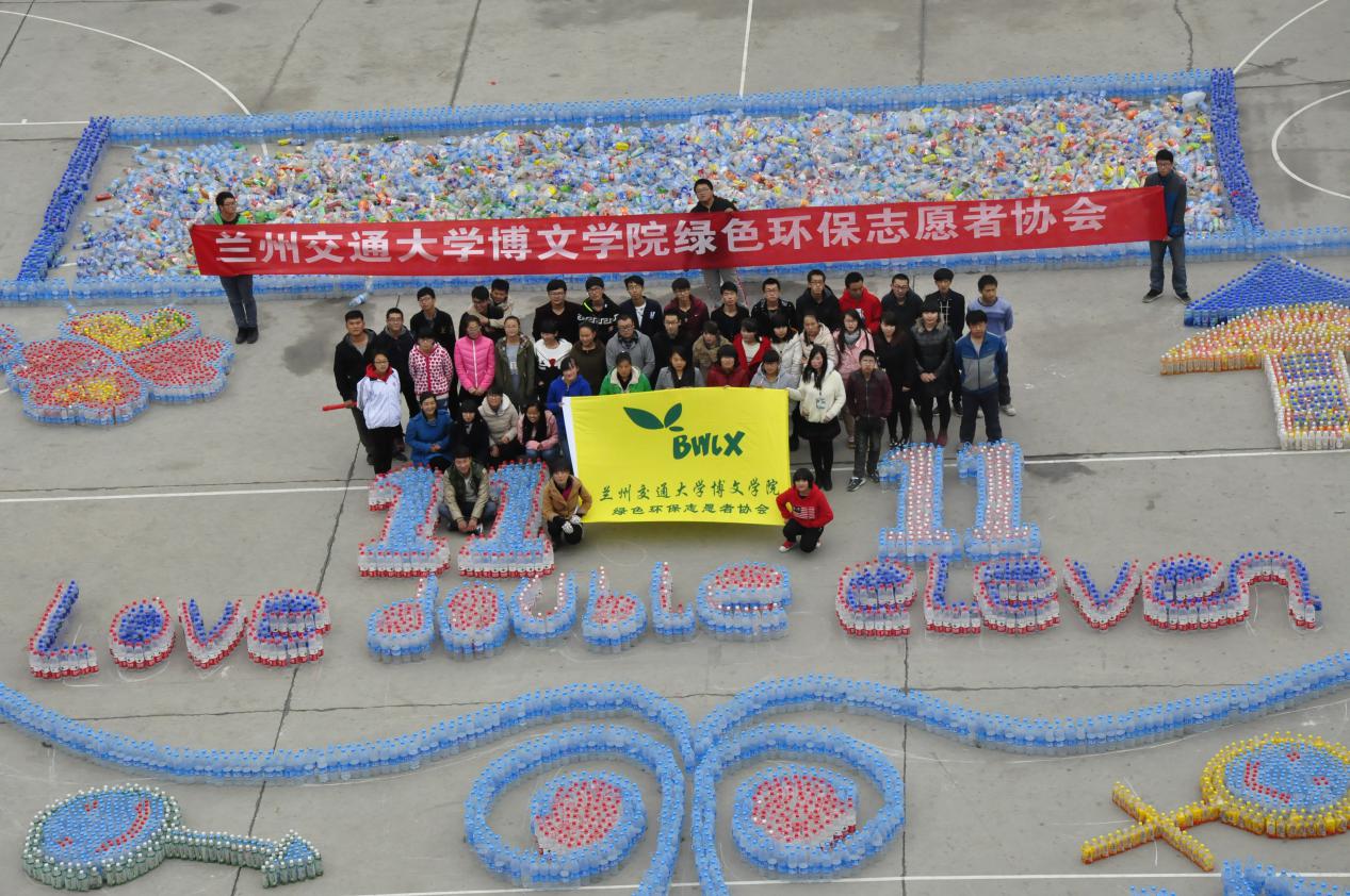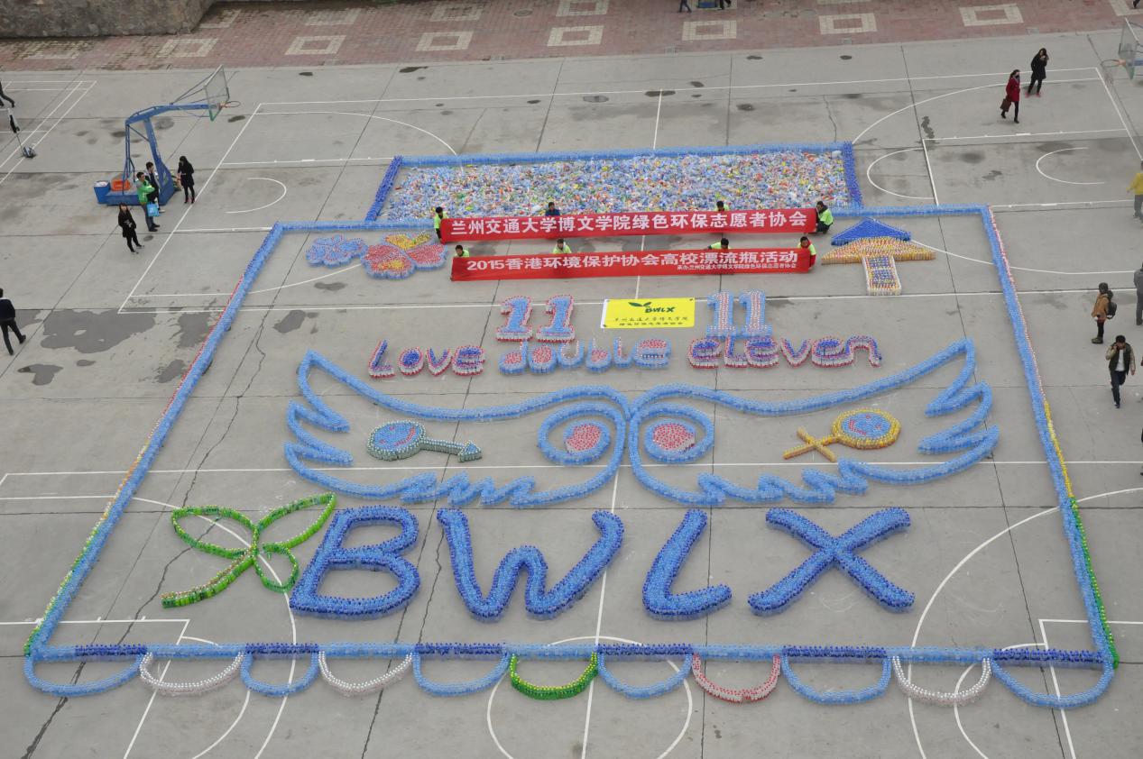 2015年11月7日,兰州交通大学博文学院绿色环保志愿者协会进行了漂流瓶的摆放图案活动。