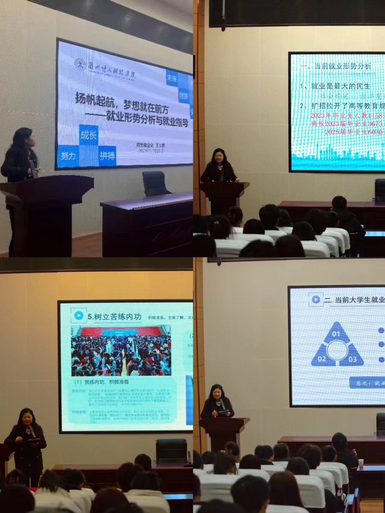 宣讲会上,招生就业处王少丽副处长一方面强调了当前就业竞争越来越激烈,公招性岗位招聘大幅减少,用人单位对当代大学生的工作能力要求也更加严格,并且重点招聘高质量、高素质人才。另一方面指出了高校开展就业指导工作普遍更加关注职业规划理论知识的传授,而对培养大学生的就业观不够重视,学校主要培养理论方面的知识,学生的实践能力亟待加强。最后为大学生就业提出了以下几点策略,一是认准自己的能力,精确定位,提前了解自己想去的公司的招聘条件,为就业做好准备工作;二是摆正自己的求职心态,合理规划求职时间;三是提高自己的整体素质,维持较好的学习状态,提高自己的适应能力;四是树立好正确的求职心态。