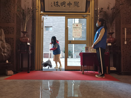 本来今天早上的气温是很低的,但当我们到达石源园林山庄的校门口的时候柔和的阳光已经赶走了低温,气温已经回升到让我们感到暖洋洋的了,当孩子们兴致勃勃到达时,他们在阳光下伸了伸懒腰,开始投入到今天的常规志愿活动之中。当我们明确分工之后,志愿者们迅速投入到各个岗位上,其中女孩子分别在前院当中打扫落叶,在博物馆讲解门票的购买、引导游客参观,有条不紊的进行着属于自己的那一份工作,我能看到她们额头细密的汗珠,成长很辛苦,但她们无怨无悔;男孩子们分别在山头和饮茶的平台清理落叶、打扫步行的小道,刚刚步入大学生活的他们是第一次体验志愿者活动,尽管辛苦,我看见了他们握紧清洁工具的双手,突然明白,大家都很珍惜这次能够让自己有所成长的志愿者活动,从他们的行动中不难看到,大家都有一种坚韧不拔的精神,这也是我们工作中和生活中不可或缺的品质。