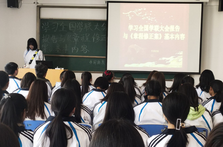 古人云:无规矩不成方圆。什么是规矩?《章程修正案》就是新青年的规矩。它渗透在新青年生活的方方面面,学习了解新章程是我们懂得规矩的重要体现。为了让同学们树立坚定理想信念,培育高尚品格,练就过硬本领。为了让同学们遵循和贯彻党的新章程,促进全面发展。也为了在矢志奋斗中紧跟党和国家的领导,为党和国家事业发展做出新的贡献,谱写新时代的青春之歌。外国语系于2020年11月14日在综合教学楼0709教室开展学习学联大会报告与《章程修正案》基本内容活动。